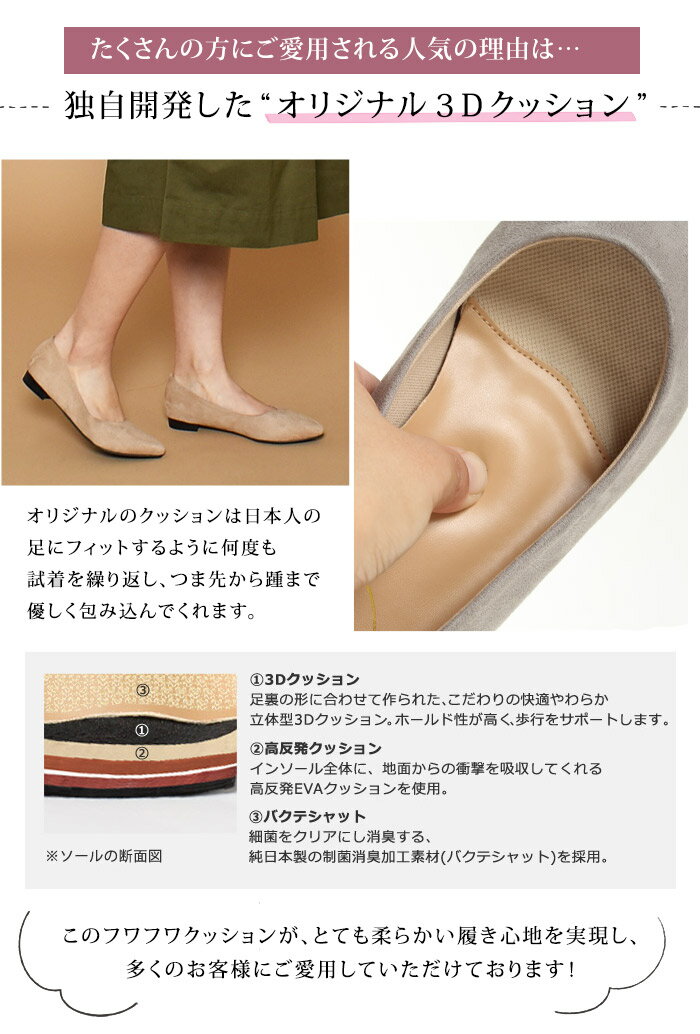 独自開発したオリジナル3Dクッションで、究極の履き心地を追求したシンプルなプレーンパンプスです。