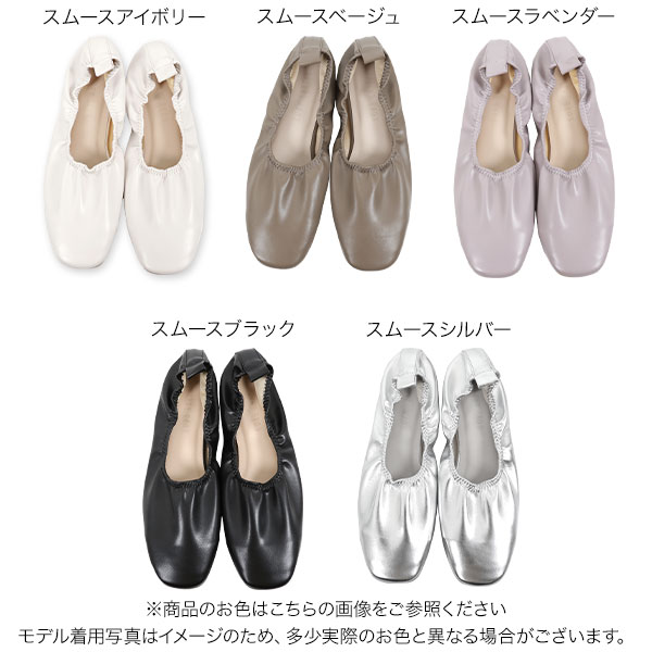 履き口にゴムが入っておりフィット感が心地良いギャザーフラットパンプス。